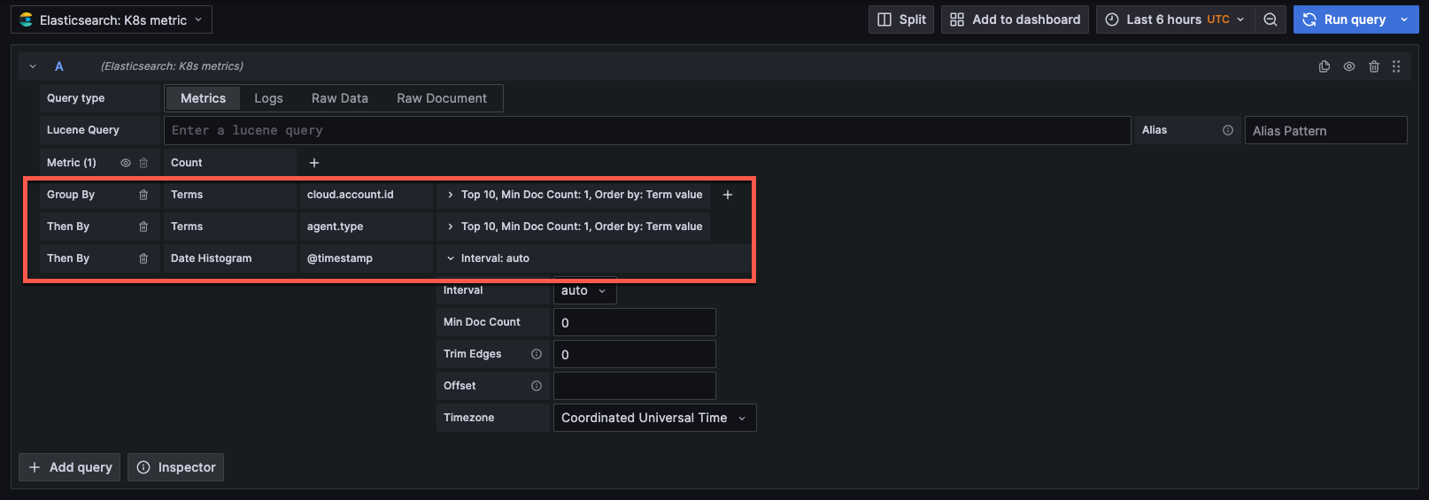 Bucket - Bucket aggregations don’t calculate metrics, they create buckets of documents based on field values, ranges and a variety of other criteria. Refer to Bucket aggregations for additional information. Use bucket aggregations under Group by when creating a metrics query in the query builder.