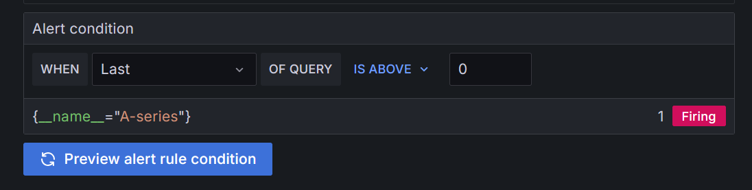 • Keep Last as the value for the reducer function (WHEN), and IS ABOVE 0 as the threshold value. This is the value above which the alert rule should trigger.
