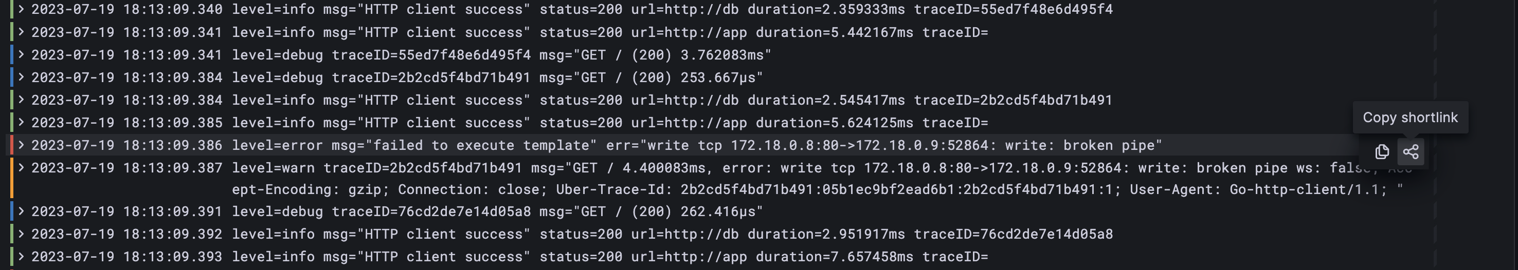 New functionality for linking of Loki log lines in Explore allows you to quickly navigate to specific log entries for precise analysis. By clicking the Copy shortlink button for a log line, you can generate and copy a short URL that provides direct access to the exact log entry within an absolute time range. When you open the link, Grafana automatically scrolls to the corresponding log line and highlights it, making it easy to identify and focus on the relevant information.