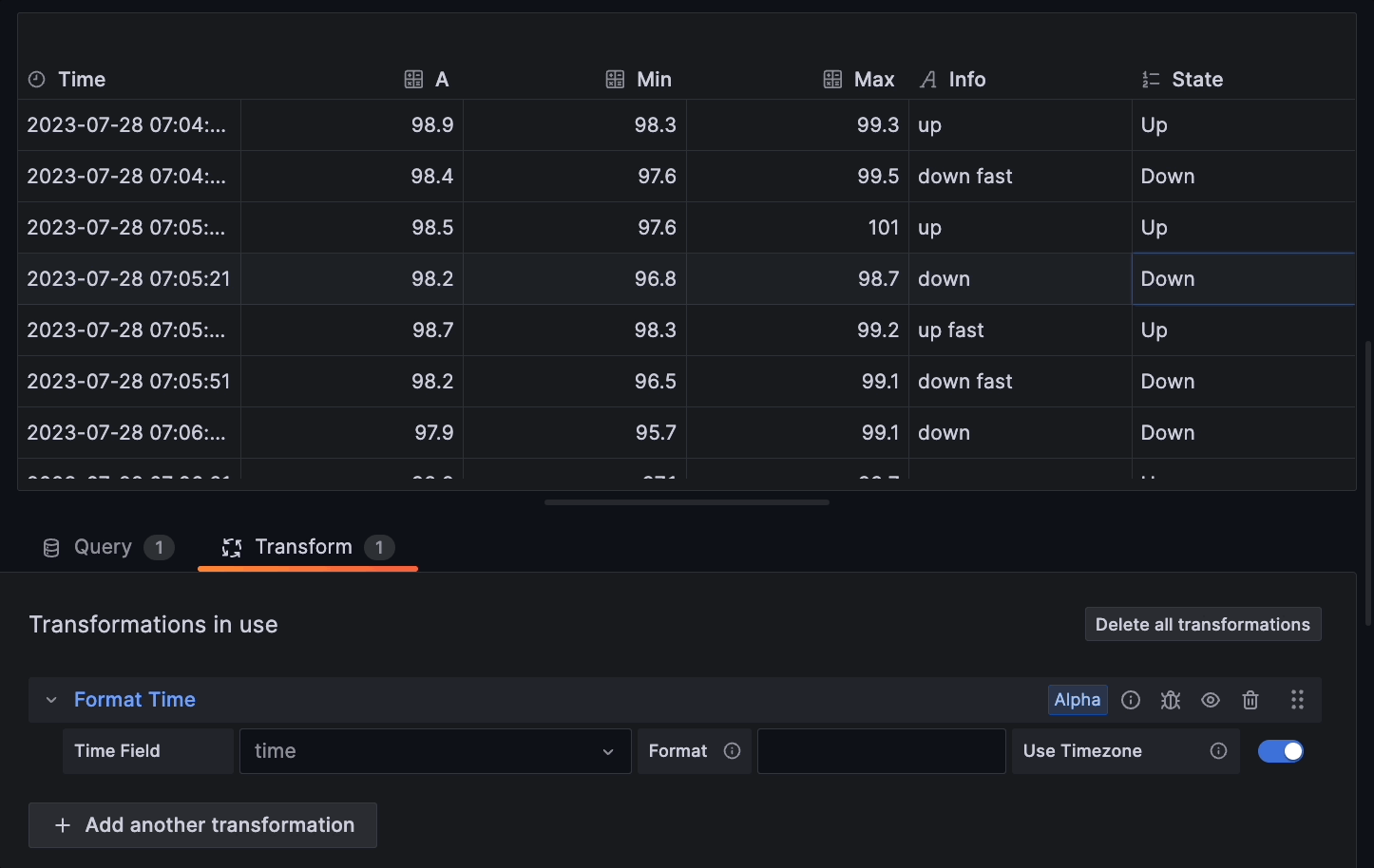 When working with date and time data, it can be useful to have different time formats. With the new Format Time transformation, you can convert any time format to any other one supported by Moment.js. When used in conjunction with the Group by transformation, this can also be used to bucket days, weeks, and other time windows together.