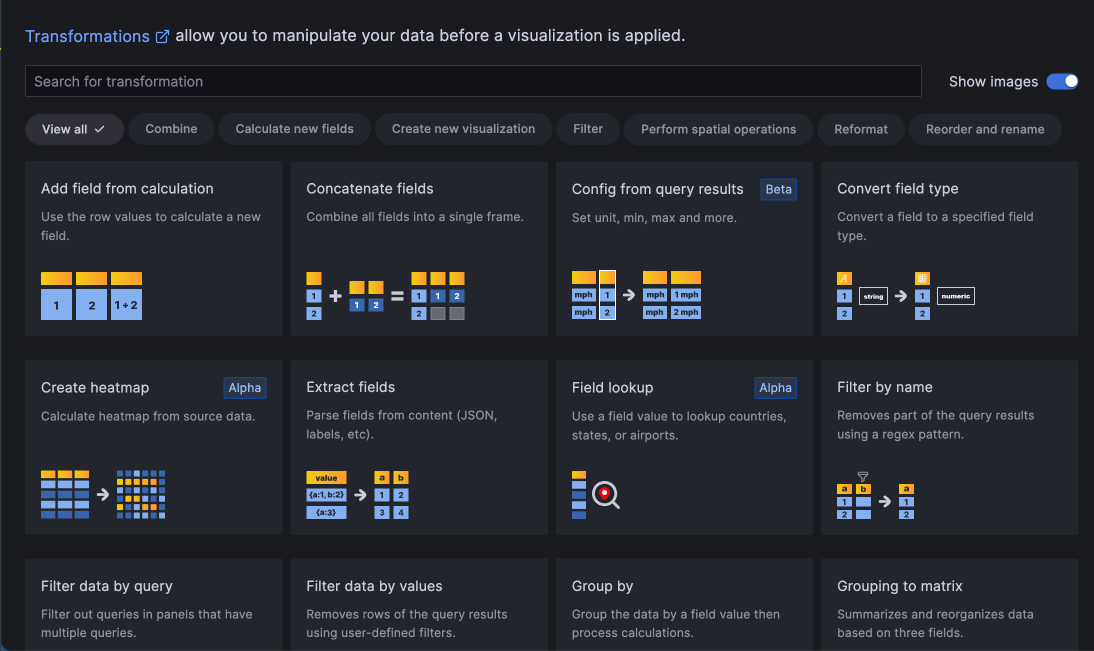The transformations tab has an improved user experience and visual redesign. Now, transformations are categorized, and each transformation type has an illustration to help you choose the right one.