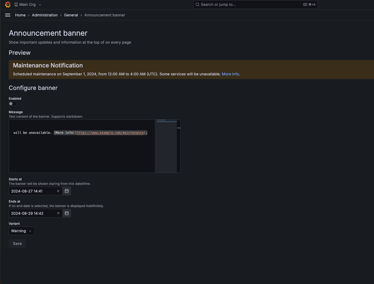 Grafana admins struggle to effectively communicate important updates and maintenance information to their users through traditional channels like email and Slack. Now you can display customizable banners within the Grafana interface to ensure critical information is visible and timely. This ensures that all users are immediately informed of important updates, maintenance schedules, compliance info, or other crucial messages, reducing the likelihood of missed communications and enhancing overall user awareness and engagement.