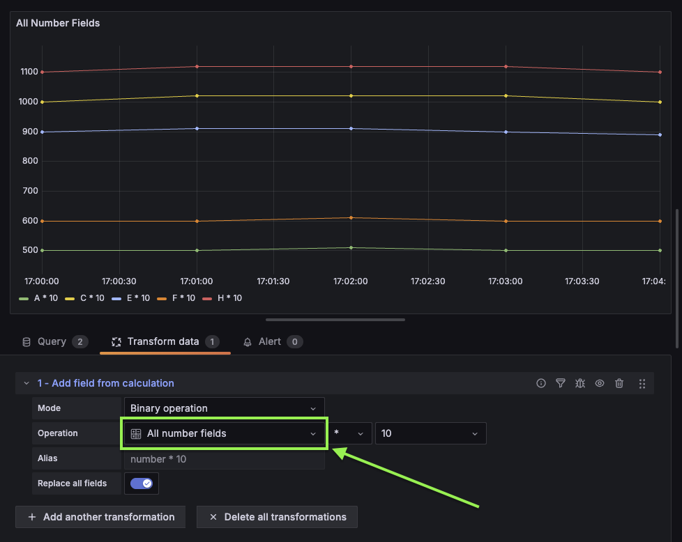 When you set up a binary operation using the Add field from calculation transformation (for example, dividing each column by a certain value), there’s a new All number fields option available to select. Use this to apply a mathematical operator to multiple number fields simultaneously. This feature is particularly useful when you’re scaling or offsetting data containing multiple, dynamically-named fields, allowing the transformation to be applied when dealing with unknown field names.